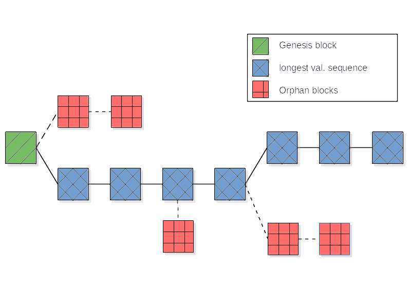Thus, referring back to the diagram at the beginning of this section, the green block represents the beginning of the chain (genesis block). While the blue blocks represent the longest validated sequence and thus the main chain, the red blocks represent so-called ‘orphans’, blocks that could not be further validated. Thus, the graphic represents the sketch of a blockchain.