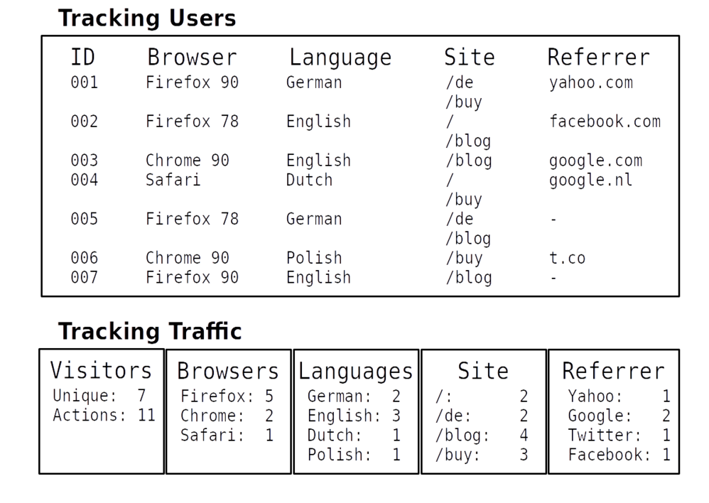 The information a website operator is often times actually interested in, are traffic measures, as well as some additional information about broad, non-personal demographic of visitors. However, it is usually completely irrelevant to know characteristics of each and every visitor individually. Instead, it is more important how many (or what share of) visitors come from country X, how many use the web-client (browser) Y and how many look at a specific sub-page of your website, etc. I.e. characteristic-tables which are independent from one another. [9]