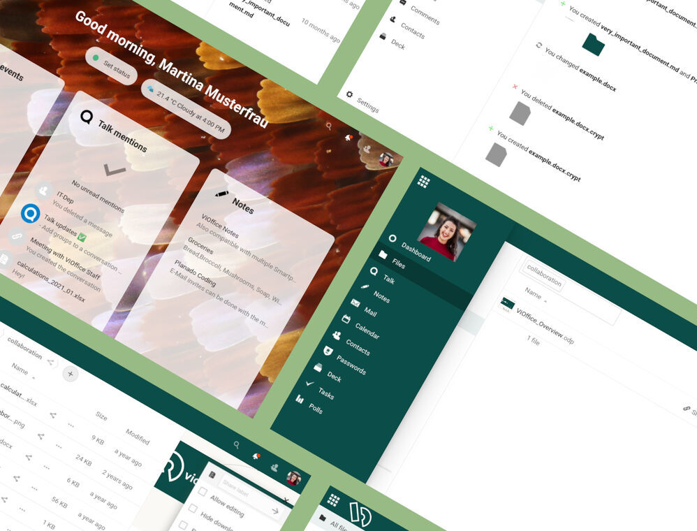 The ViOffice Cloud is the core of ViOffice. It is largely based on Nextcloud Hub and integrates a variety of other Open Source cloud and office applications that are used daily by millions of people worldwide. In the cloud you store your documents and data without using local storage. Any data format can be stored here encrypted and secured. We would like to explain in more detail how this differs from services like Google Drive. A clear comparison can be found on our website.